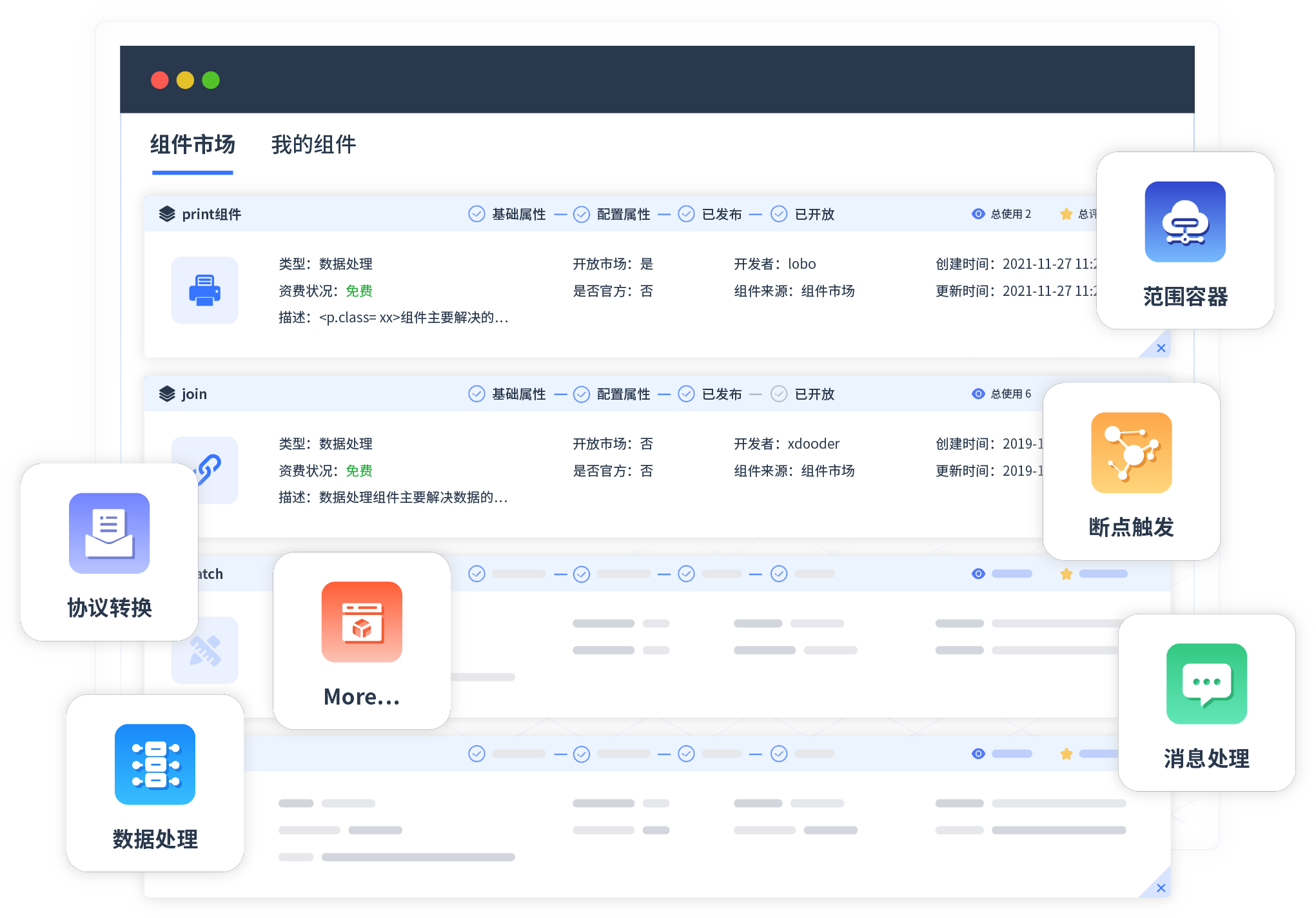 针对集成场景,william威廉中文官网提供组件市场,例如协议转换、消息处理、文件操作等。除平台提供的组件外,客户可以自定义所需组件。